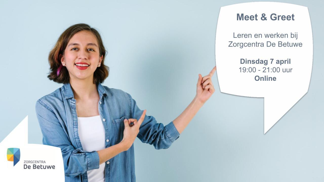 Ben je op zoek naar een baan waarin je jezelf kunt ontwikkelen? Kom dan naar onze Meet & Greet op dinsdagavond 7 april a.s. van 19.00 tot 21.00 uur! We vertellen je graag meer over werken in de zorg én over de mogelijkheden om te werken en leren bij Zorgcentra De Betuwe. Een mooie kans om vrijblijvend kennis te maken en je vragen te stellen. Hopelijk zien we je dan!